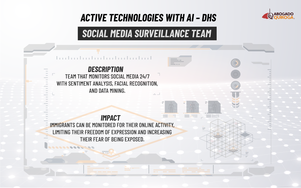 This technology uses sentiment analysis, facial recognition, and text analysis tools to identify potential threats, locations, or connections between migrants. Non-citizens could be exposed through their digital activity, as public content or seemingly insignificant messages could be interpreted as «indications» of risk.