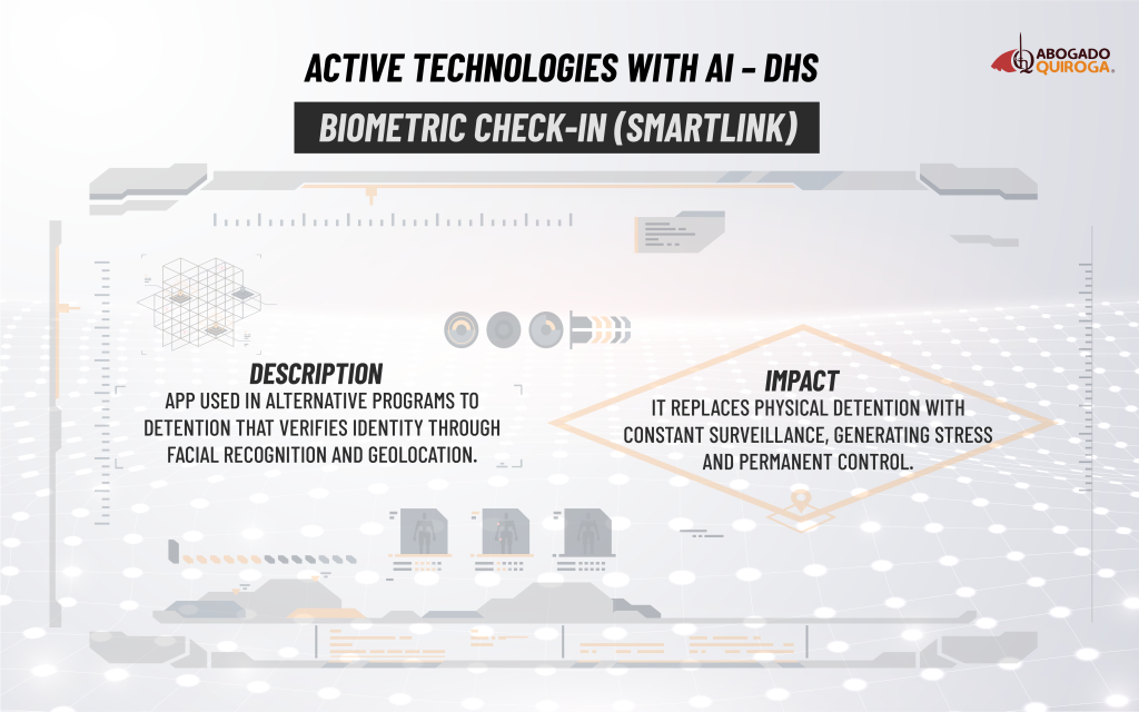 The system compares the user’s facial image with the one stored in the DHS database, verifying their identity in real time. Although supposedly a «humanitarian» alternative to detention, in practice it is a form of constant, digitalized surveillance, as migrants must comply with frequent notifications and their location is constantly exposed. This can generate stress and a feeling of being under constant surveillance.