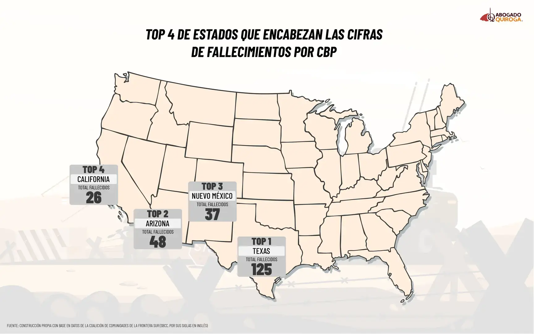 Le siguen Arizona con 48 y Nuevo México con 37, estados que también forman parte del corredor principal de paso hacia el interior del país. Por su parte, California registra 26 muertes, sumando así la mayoría de los casos dentro de los estados que comparten frontera con México.