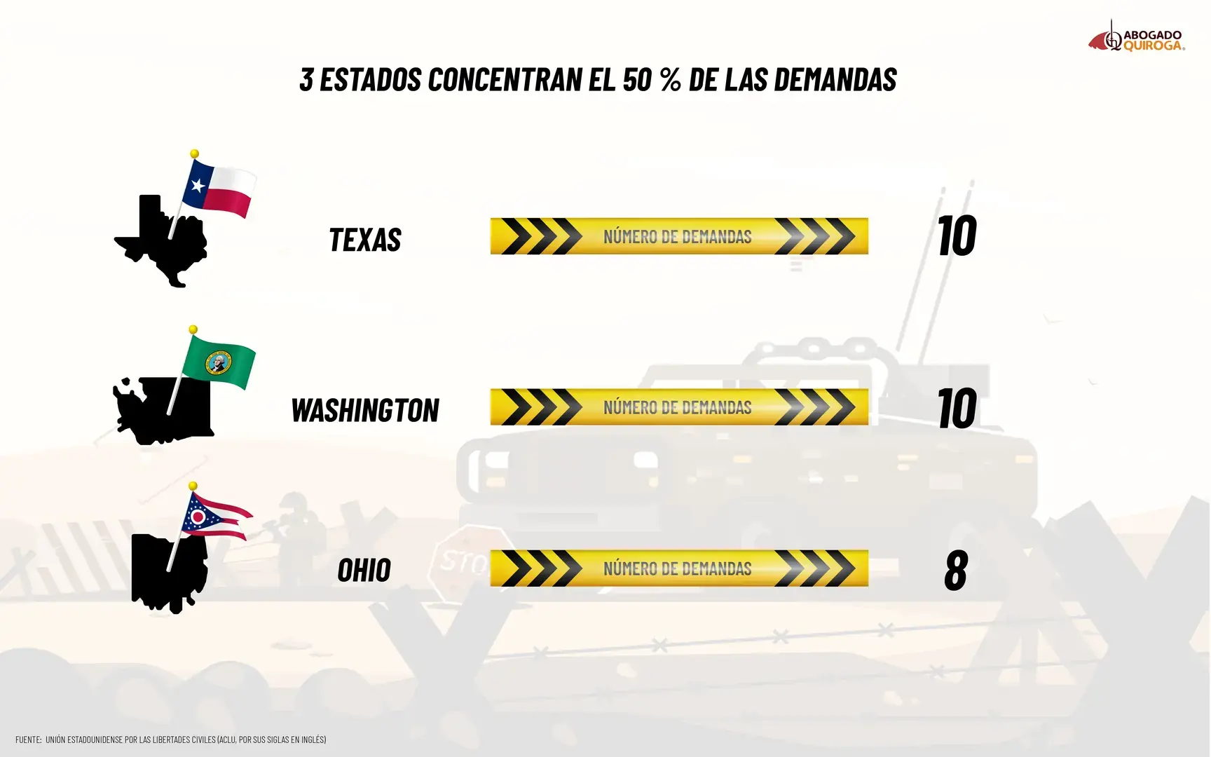 Los datos divulgados por esta organización muestran claramente que Texas y Washington encabezan la lista con diez demandas cada uno, seguidos por Ohio con ocho y California con siete y es que no se trata únicamente de estados fronterizos, sino de territorios donde la presencia y las operaciones de CBP han generado cuestionamientos persistentes por el uso de la fuerza.