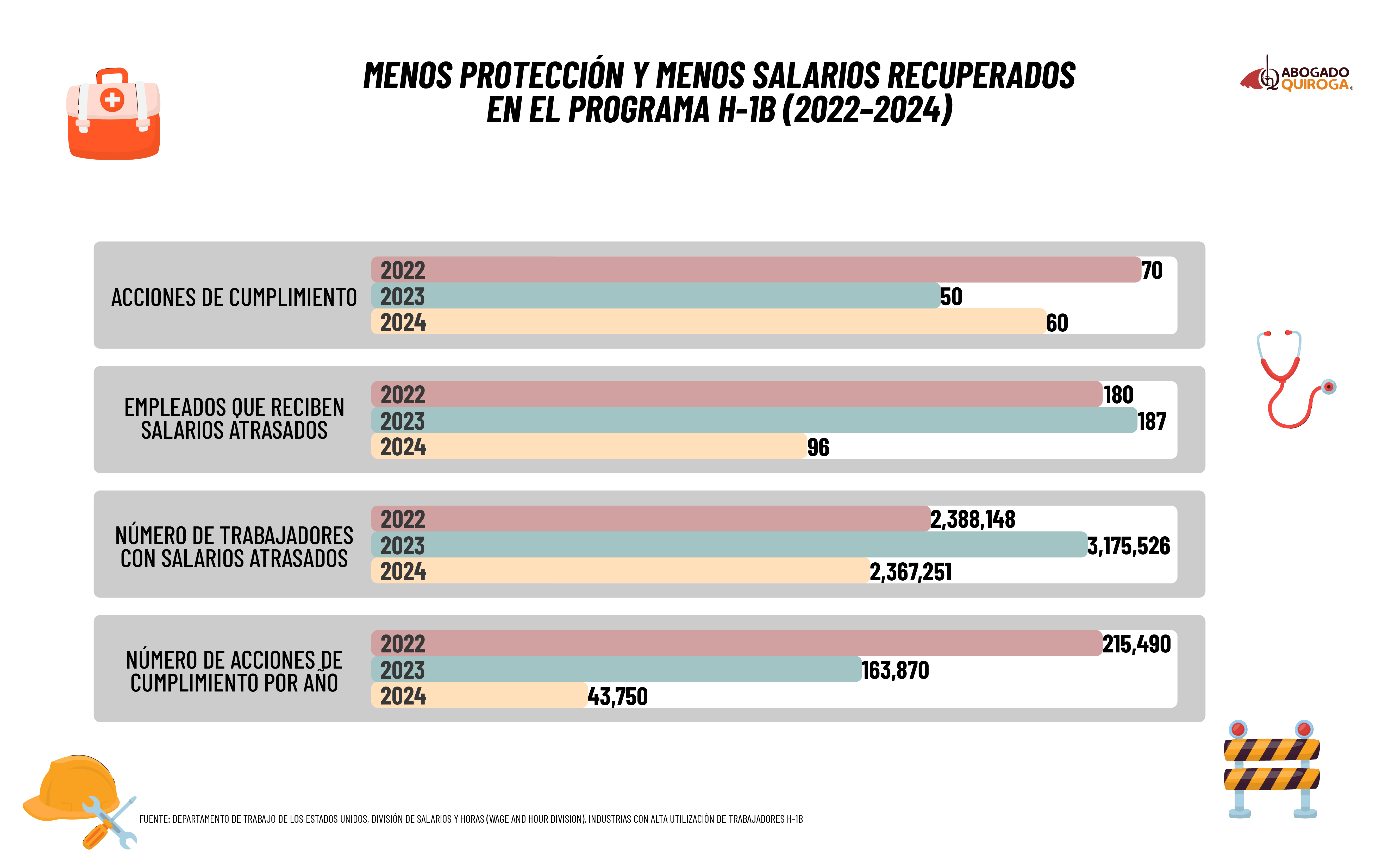 Los datos más recientes del Departamento de Trabajo de Estados Unidos (DOL) muestra un panorama mixto en el cumplimiento laboral relacionado con trabajadores H-1B entre los años fiscales 2022 y 2024 y aunque en 2024 hubo un ligero repunte en las acciones de cumplimiento frente a 2023, al pasar de 50 a 60 intervenciones, las cifras siguen por debajo de las registradas en 2022, cuando se alcanzaron 70 intervenciones, lo que resulta aún insuficiente, ante el alto número de casos registrados.