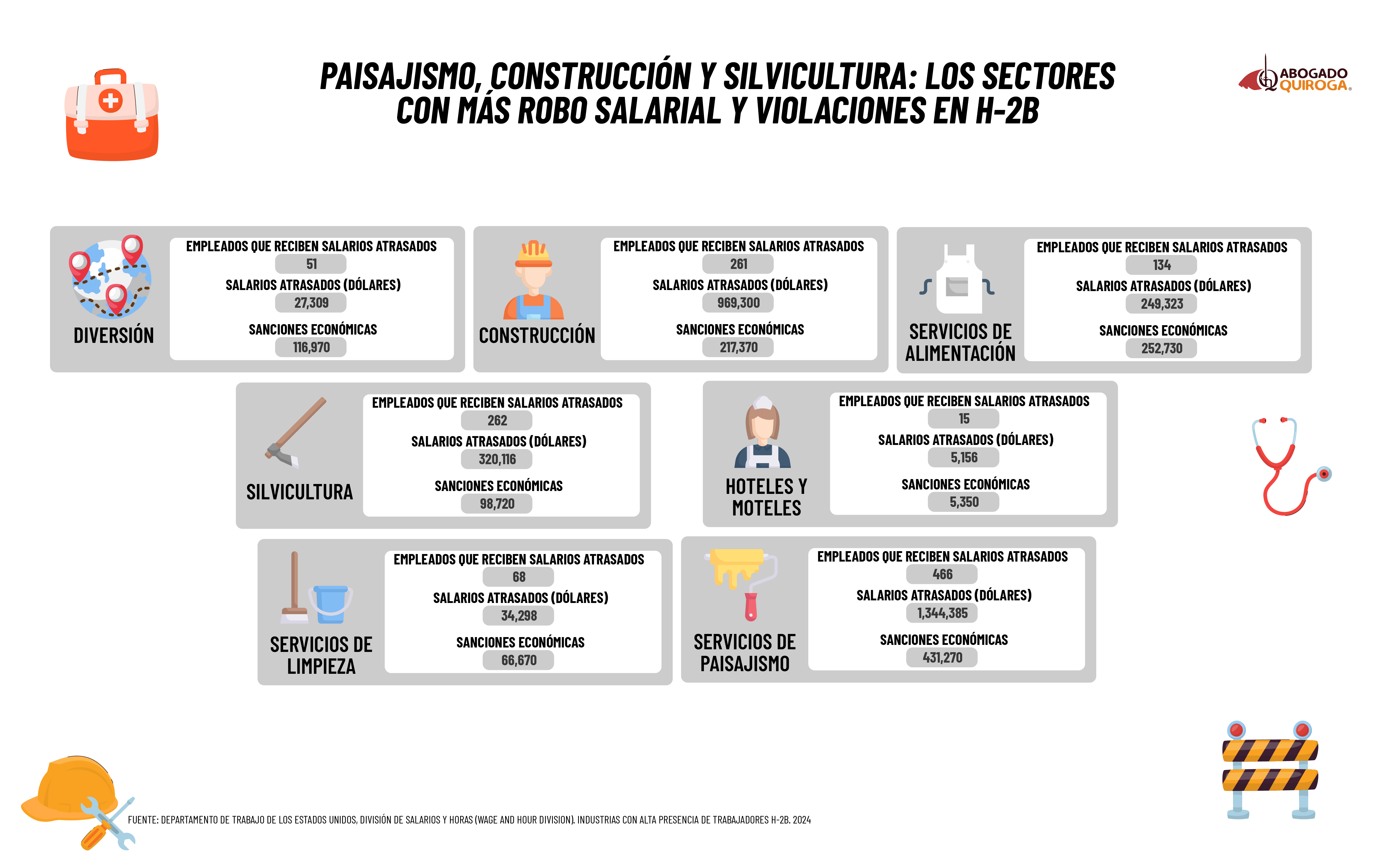 Los datos muestran que las industrias con mayor dependencia de mano de obra H-2B concentran también los niveles más altos de violaciones laborales, siendo el paisajismo, la construcción y la silvicultura los sectores donde se registran los mayores impactos tanto en trabajadores afectados como en montos adeudados.