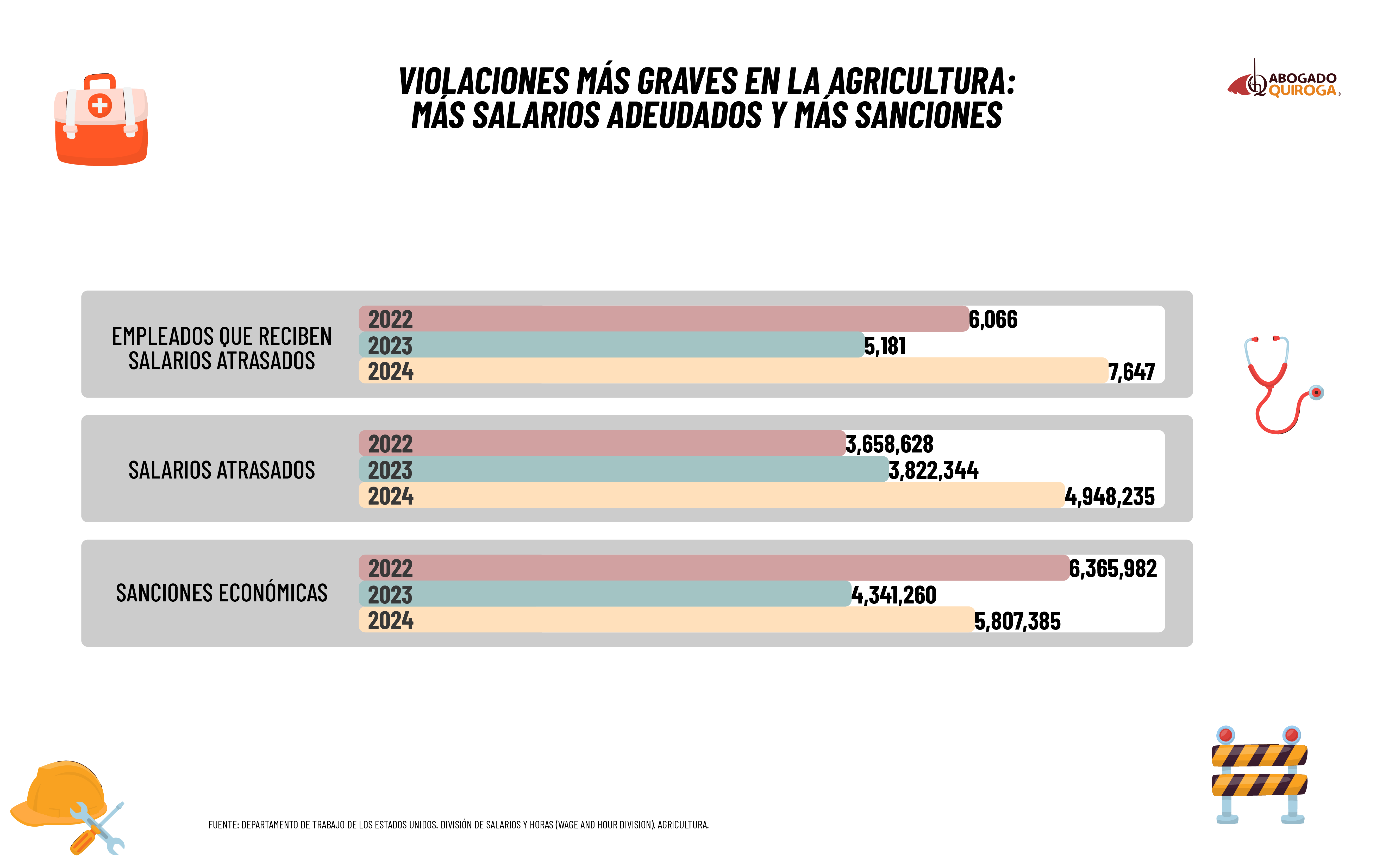 Así mismo, el Departamento de Trabajo señala que el sector agrícola, en el que aplica la visa H2A, registró en 2024 un aumento significativo en el número de trabajadores que recibieron salarios atrasados, pese a que las acciones de cumplimiento disminuyeron respecto a años previos. En el año fiscal 2024, 7,647 empleados obtuvieron pagos atrasados, una cifra notablemente superior a la de 2023 que registro 5,181 y también mayor que la de 2022 que alcanzó 6,066.