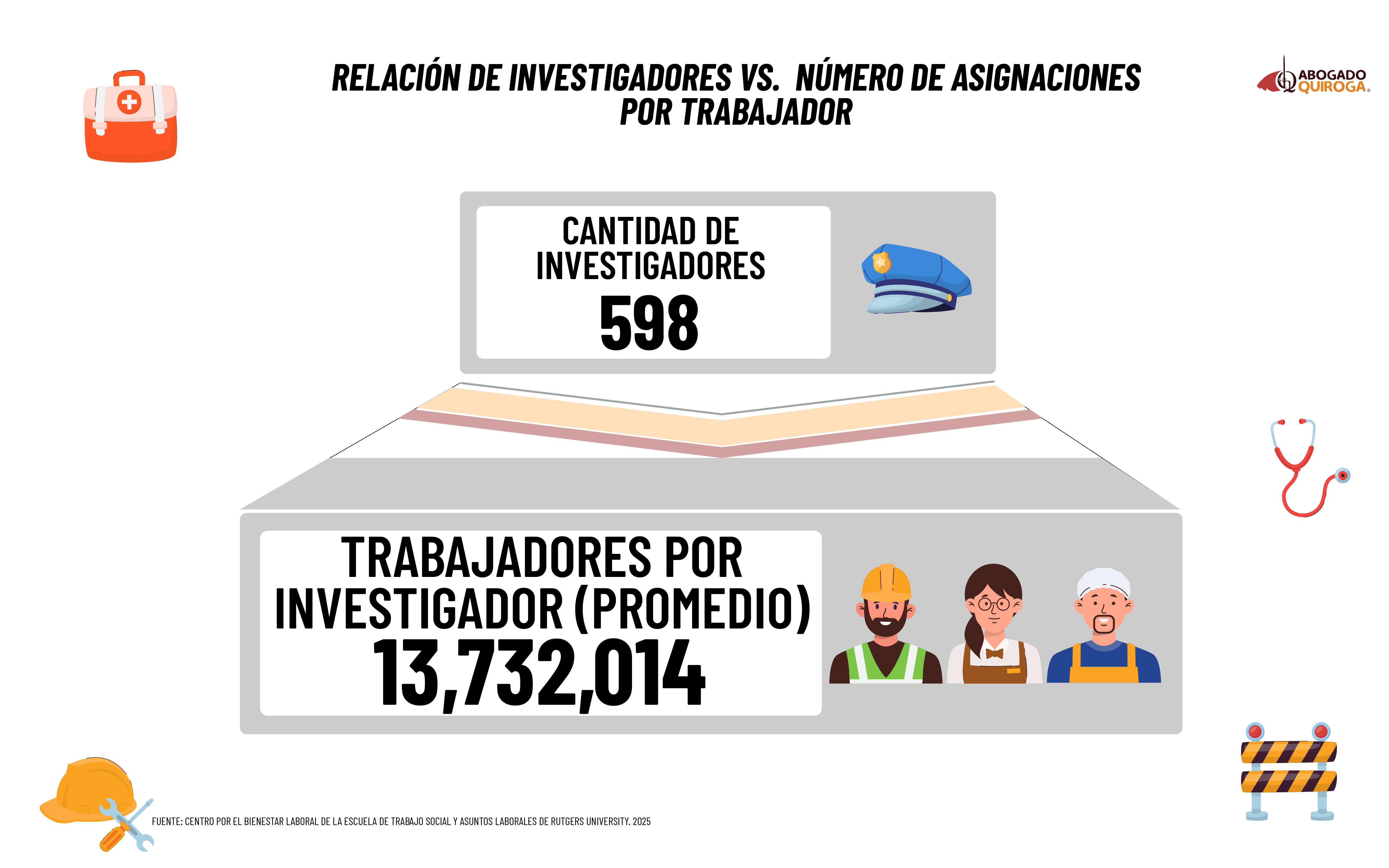 Las cifras reflejan que, en 2025, mientras estados como California y Texas cuentan con los equipos más grandes, 74 y 68 investigadores, respectivamente, también concentran un volumen muy alto de trabajadores por cada inspector: 266,403 en California y 232,037 en Texas.