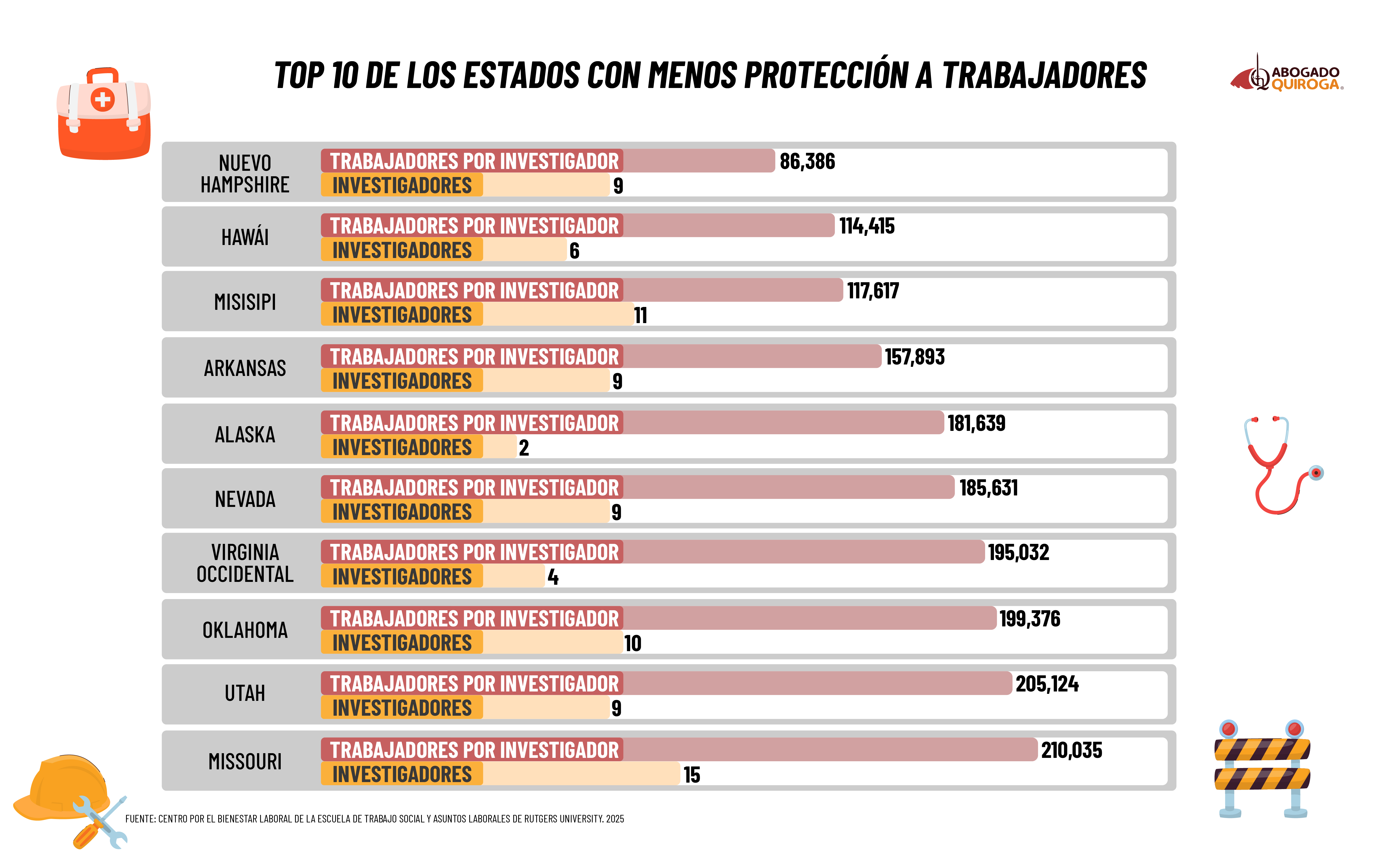 En contraste, estados pequeños como Nuevo Hampshire y Hawái muestran una supervisión más nivelada: 86,386 y 114,415 trabajadores por inspector, cifras muy por debajo del promedio nacional. Alabama, Misisipi y Missouri también presentan cargas relativamente menores.