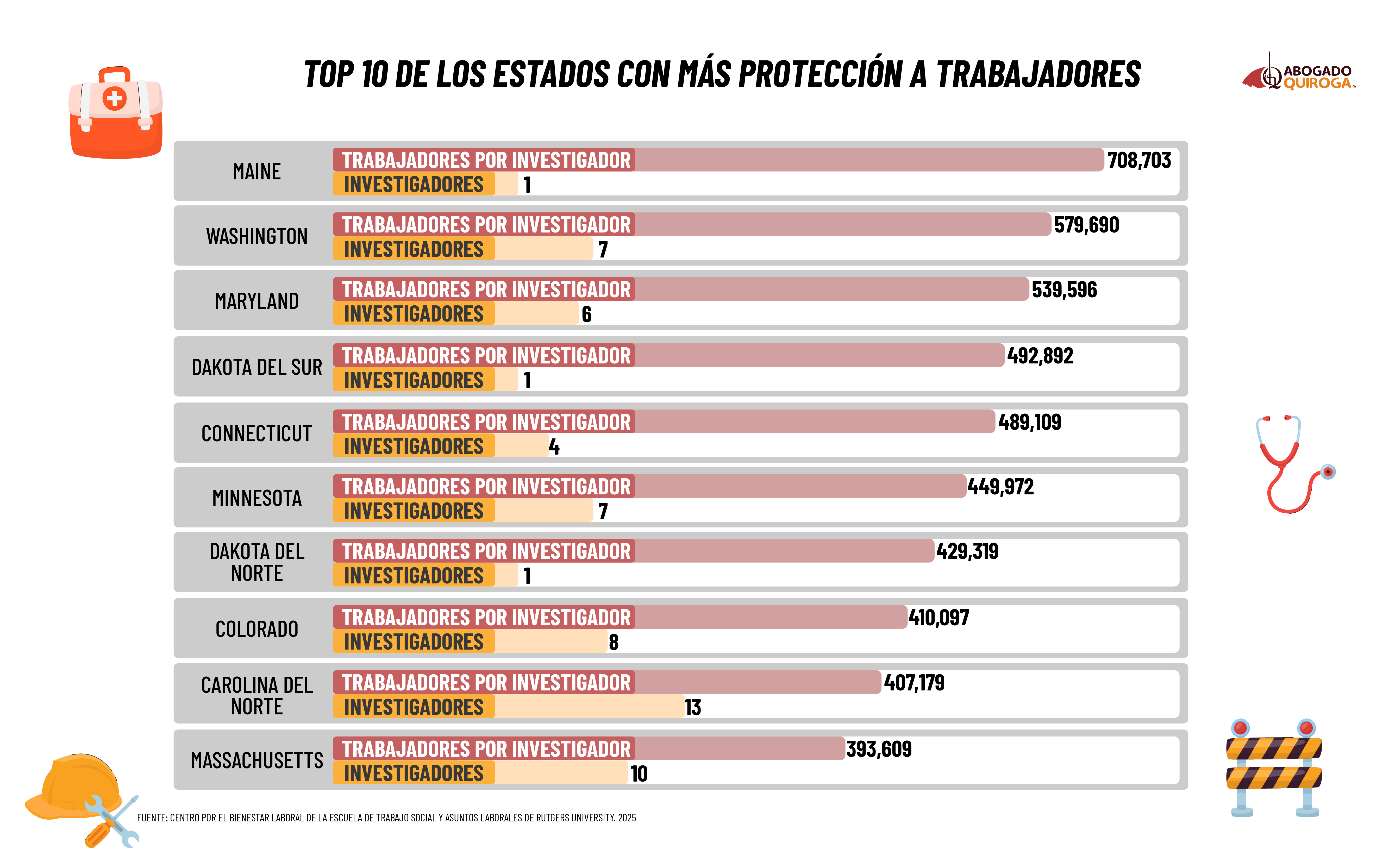 Otros estados enfrentan desafíos aún mayores. En Washington, por ejemplo, cada investigador debe cubrir en promedio a 579,690 trabajadores. Maine y Maryland también presentan cargas extremadamente elevadas, con 708,703 y 539,596 trabajadores por investigador, pese a tener plantillas mínimas.