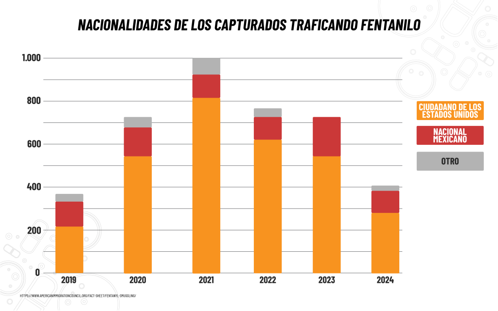 Datos obtenidos por el Consejo Americano de Inmigración, a través de la Ley de Libertad de Información (FOIA), confirman que la mayoría de las personas arrestadas por contrabando de fentanilo a Estados Unidos en los puertos de entrada de la frontera sur son ciudadanos estadounidenses. En total, el 81.2% de todas las incautaciones a lo largo de la frontera suroeste (en oficinas de Campo como San Diego, Tucson, El Paso y Laredo) entre los años fiscales 2019 y hasta junio de 2024 fueron a ciudadanos estadounidenses, superando las 3 mil personas. Mientras que, según las cifras disponibles se podría deducir que el número de ciudadanos mexicanos estaría en alrededor de 748. (https://www.americanimmigrationcouncil.org/fact-sheet/fentanyl-smuggling/)