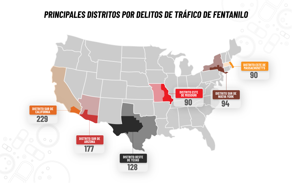 Dicho informe revela además los 6 principales distritos por delitos de tráfico de fentanilo: Distrito Sur de California (229), Distrito de Arizona (177), Distrito Oeste de Texas (128), Distrito Sur de Nueva York (94), Distrito de Massachusetts (90) y Distrito Este de Missouri (90).