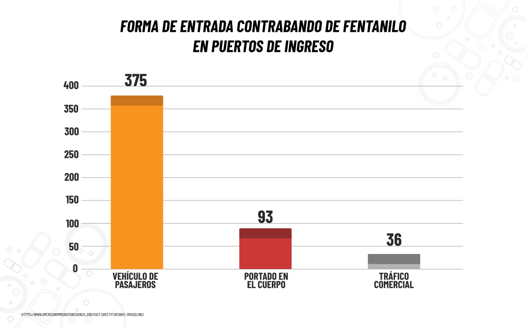 Dichas conclusiones se sustentan de un análisis que el Consejo Americano de Inmigración hizo a cerca de 700 comunicados de prensa y publicaciones en redes sociales publicadas por la CBP entre enero de 2021 y marzo de 2024. Los datos disponibles, según los investigadores, permiten rastrear información que no se reporta en portales oficiales, como por ejemplo el lugar de la incautación y cómo se intentó introducir el fentanilo a Estados Unidos. (https://www.americanimmigrationcouncil.org/fact-sheet/fentanyl-smuggling/)