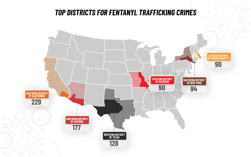 The report also reveals the top 6 districts for fentanyl trafficking offenses: Southern District of California (229), District of Arizona (177), Western District of Texas (128), Southern District of New York (94), District of Massachusetts (90), and Eastern District of Missouri (90).
