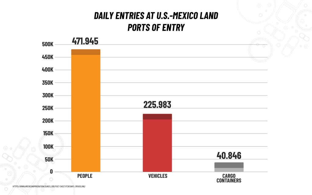 Traffickers take advantage of ports of entry because of the number of people and vehicles that cross there. For example, on an average day in March 2025, 204,241 private vehicles with 361,764 passengers crossed the border, as did 104,926 pedestrians, 21,359 trucks with 37,456 cargo containers, 352 buses with 5,255 passengers, and 31 trains with 3,390 cars.