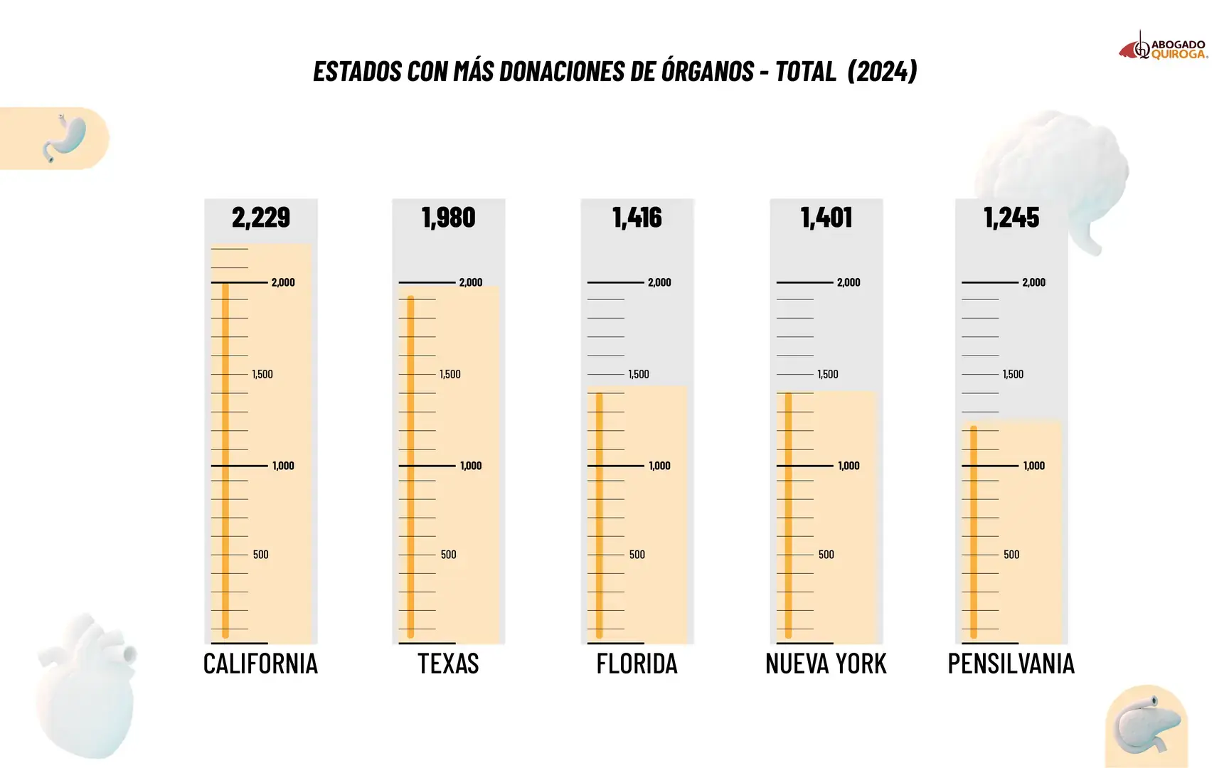 Si cambiamos la perspectiva y esta misma información la miramos bajo el total de donantes durante todo el 2024, encontramos que los estados con más donaciones de órganos coinciden en gran medida con algunos estados con mayor población inmigrante.