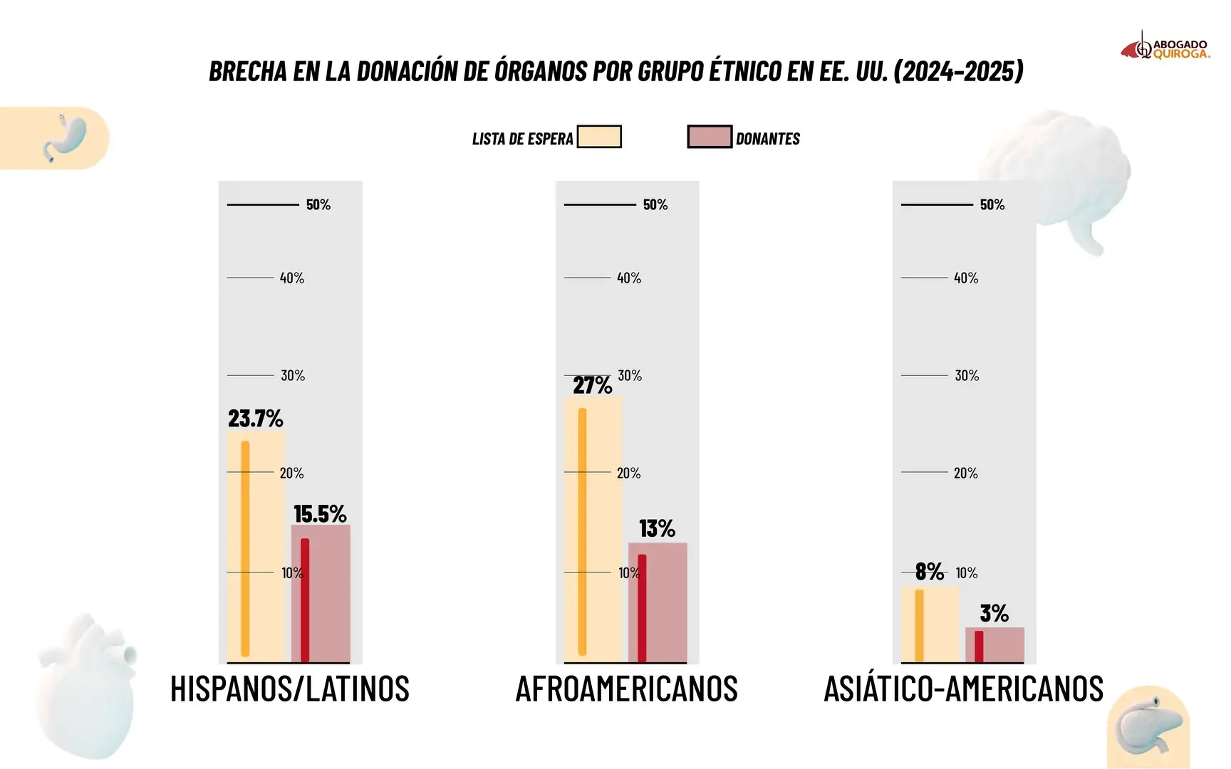 Acá detectamos una realidad un poco más compleja que las estadísticas generales no siempre cuentan. Cuando se cruzan los datos por grupo étnico, el mapa cambia. Los Hispanos/Latinos representan cerca del 23,7 % de las personas en lista de espera, frente al 15,5 % de los donantes. Entre los afroamericanos, la brecha también es evidente: cerca del 27 % se encuentra en lista de espera frente a aproximadamente 13 % de los donantes. Y en el caso de los asiático-estadounidenses, la diferencia también es marcada: alrededor del 8 % espera un órgano, mientras que el 3 % dona.