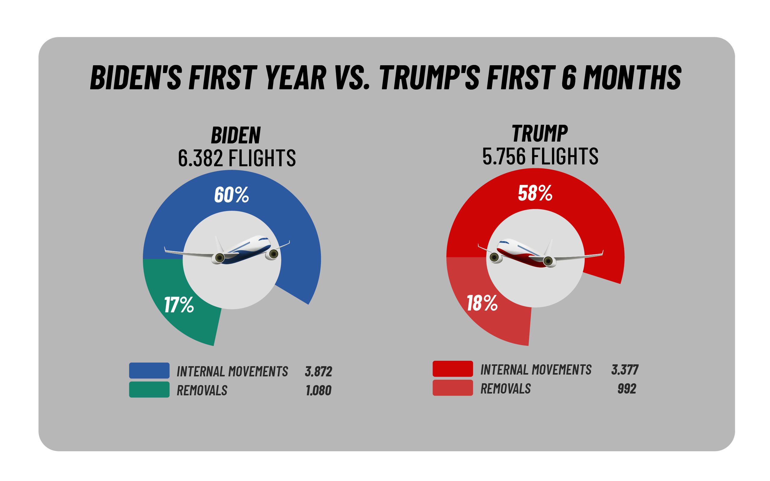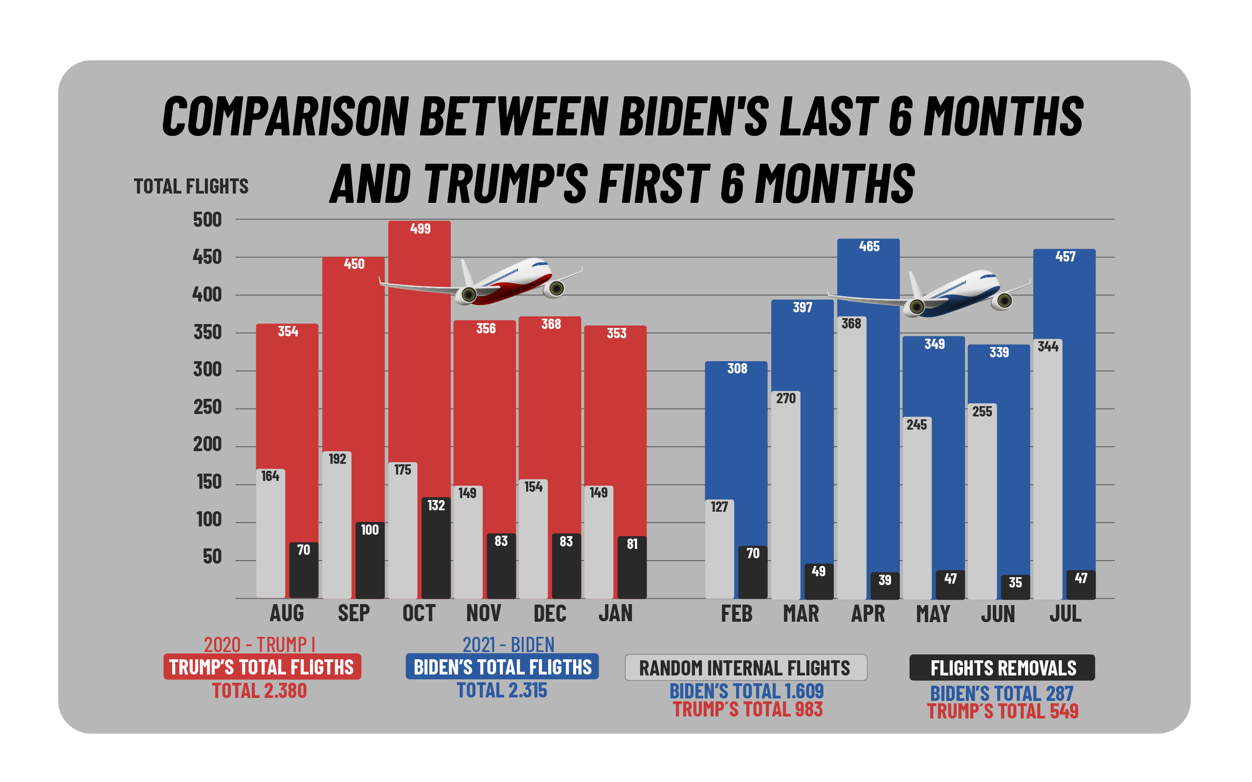 Although in half a year the Trump administration has already made 19% of the flights (5,756) of Biden’s 4 years and could register a historic record during his administration, surpassing 46 thousand flights, the behavior and its purpose is not very different from that of his predecessor, since the greater number of flights would be used to move many immigrants between states and not to deport them from the United States.