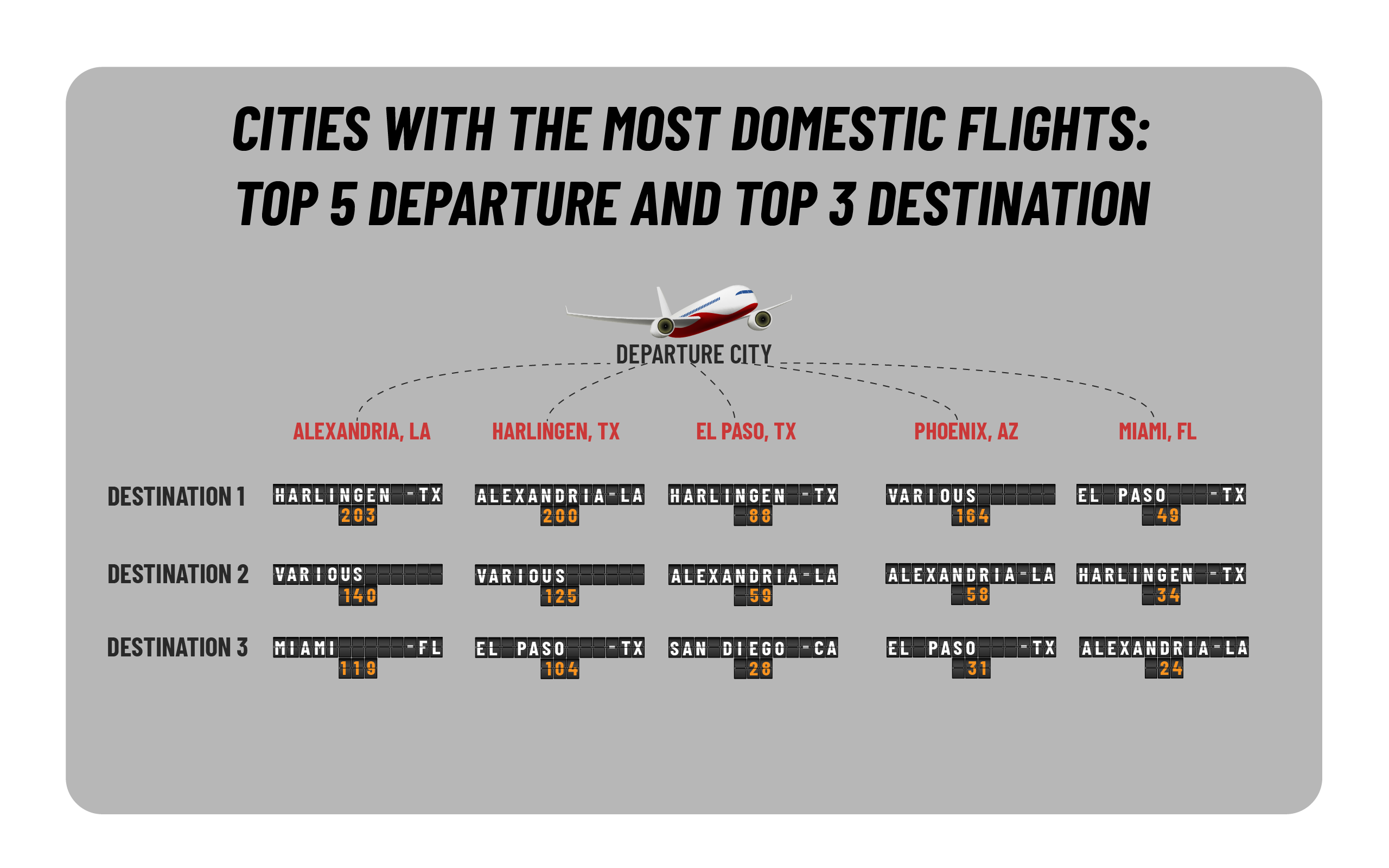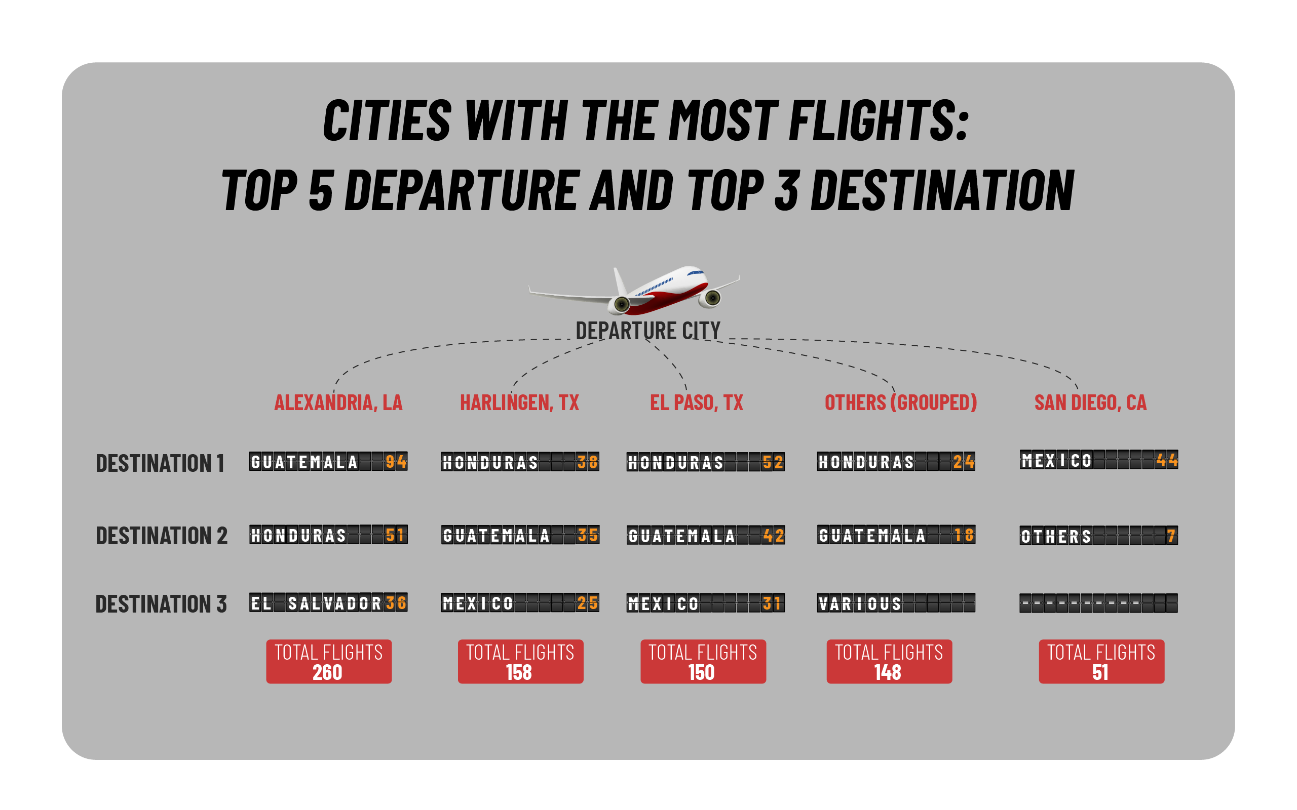 The list of departure cities is led by Alexandria, Louisiana , with 260 flights (26%) between February and July 2025, to nine countries . It is followed by Harlingen, Texas , with 158 flights (16%) to ten countries , and El Paso, Texas , with 150 flights (15%) to seven countries . Also on the list are San Diego, California , with 51 flights (5%) to three countries ; Honduras , with 48 flights (5%) to four countries. Then there is Miami, Florida , with 36 flights (4%) to at least five destinations, and Guantanamo , with 28 flights (3%) to at least seven countries.