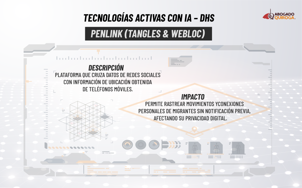 PenLink (Tangles & Webloc) tiene como principal tarea la vigilancia social y la geolocalización cruzada. Esta plataforma es utilizada por la división de Investigaciones de Seguridad Nacional (HSI) de ICE e integra herramientas como Tangles y Webloc que permiten vincular datos de redes sociales con información de ubicación obtenida de teléfonos móviles.