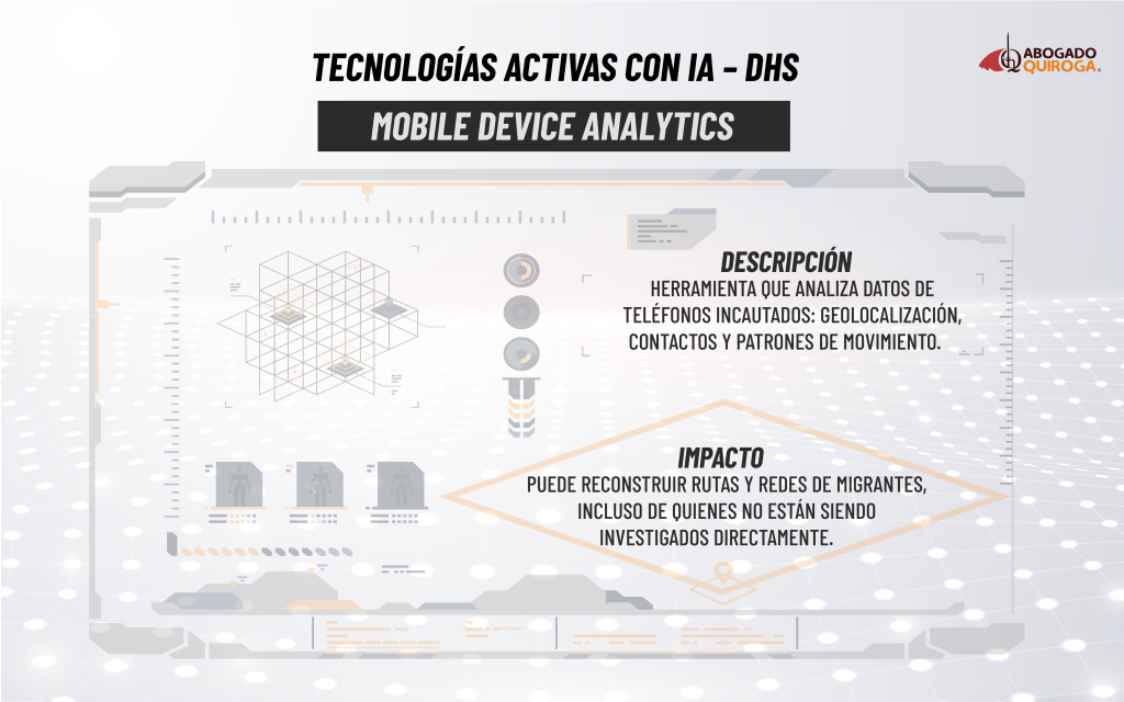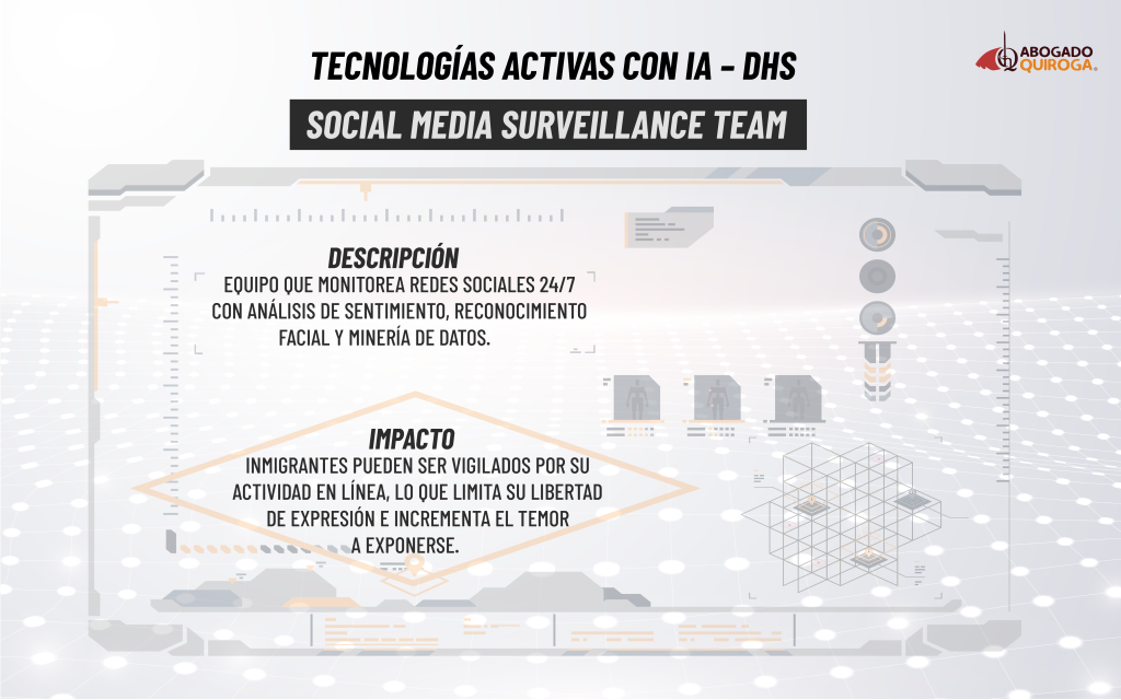 Esta tecnología usa herramientas de análisis de sentimiento, reconocimiento facial y de texto para identificar posibles amenazas, ubicaciones o vínculos entre personas migrantes. Las personas no nacionalizadas podrían verse expuestas por su actividad digital ya que contenidos públicos o mensajes sin importancia podrían ser interpretados como “indicios” de riesgo.