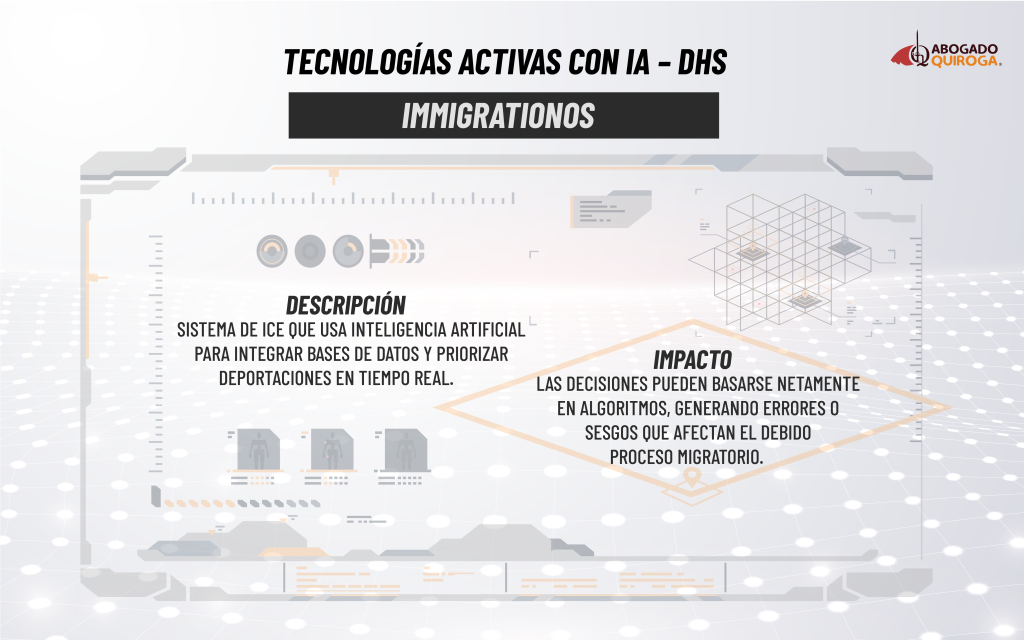 Según el portal de investigaciones Visa Verge, un documento oficial del DHS tiene bajo su inventario más de 100 funciones activas de IA al interior de la entidad: 59 son liderados por la agencia de Aduanas y Protección Fronteriza de Estados Unidos (CBP), 23 por (ICE) y 18 por el Servicio de Ciudadanía e Inmigración de los Estados Unidos (USCIS), estos casos abarcan vigilancia fronteriza, detección de fraude, procesamiento de visados, y screening de asilo, entre otros.