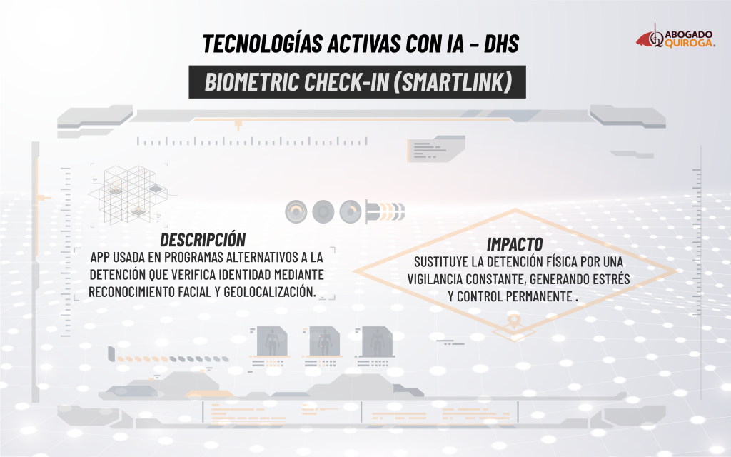Esta tecnología ya se implementa en el marco del programa de Alternativas a la Detención (ATD) y permite a ciertos inmigrantes estar en libertad mientras se resuelve su caso. ICE utiliza la aplicación SmartLINK para que las personas realicen check-ins faciales a través del celular.