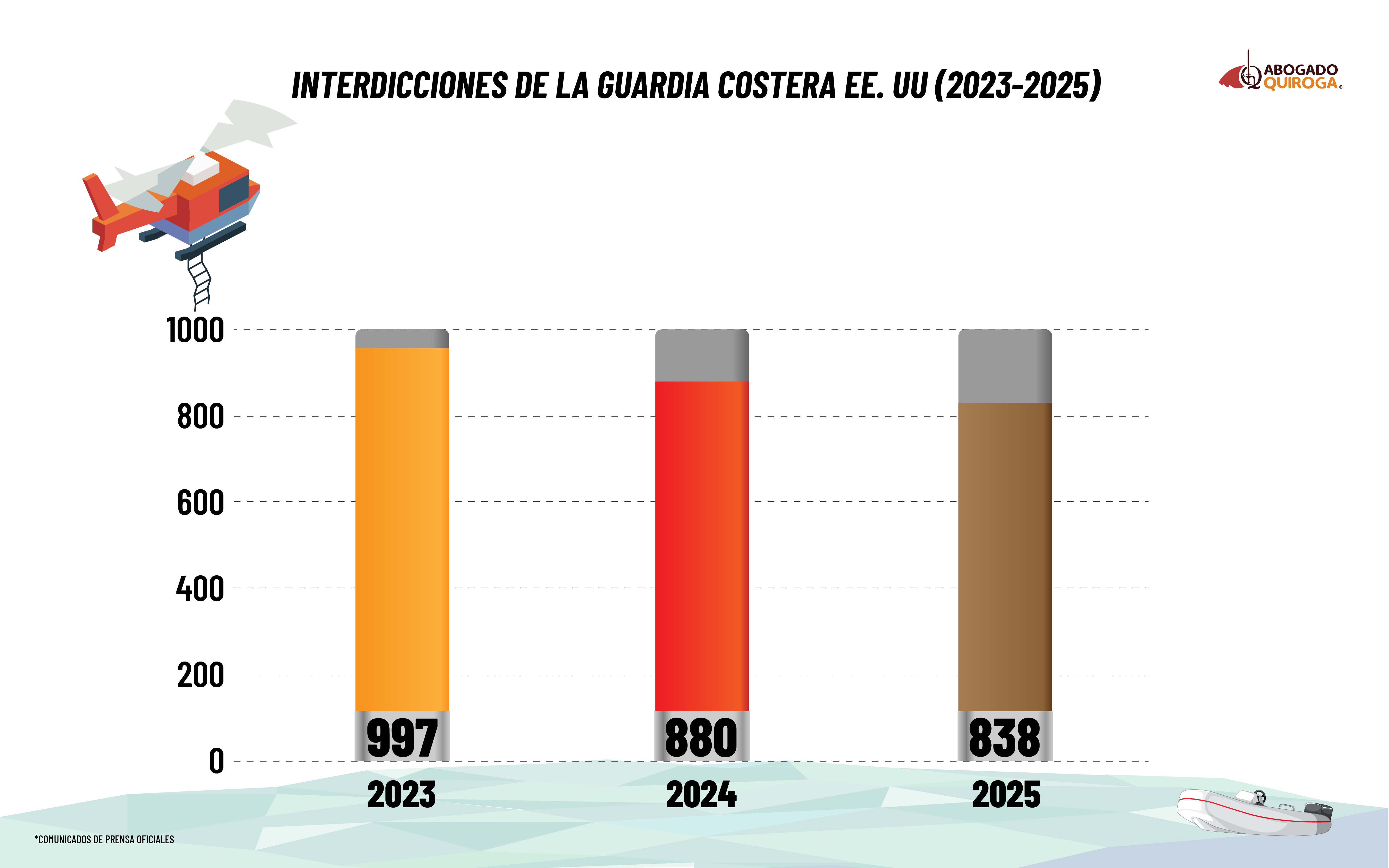 En 2023, la USCG reportó la interdicción de 997 migrantes, una cifra que disminuyó a 880 en 2024 y que en 2025 llega ya a 838. Aunque se observa una reducción aproximada del 16 % en dos años, el descenso no es abrupto, lo que sugiere que la migración por vía marítima continúa activa pese al incremento de controles y riesgos.
