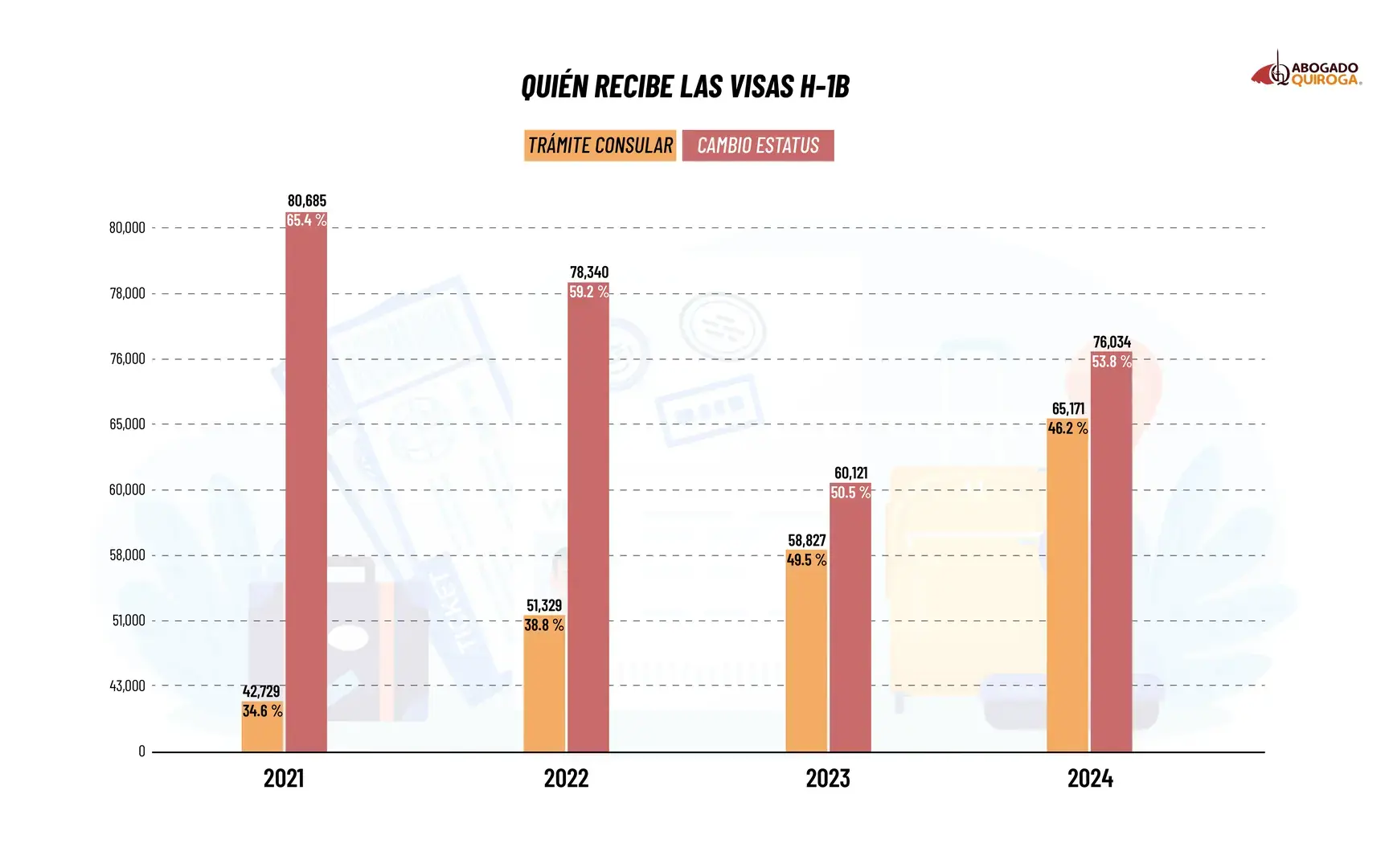 Pero si vamos más atrás y miramos 2021, el sistema ya estaba claramente inclinado hacia el cambio de estatus dentro de Estados Unidos, con un 65,4 % de los casos, frente a solo 34,6 % mediante trámite consular.
