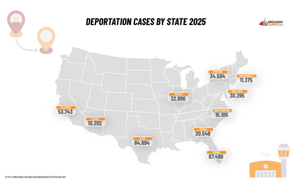 Further down the list are New York (34,504), Illinois (32,896), and New Jersey (30,295), areas traditionally considered «sanctuaries,» but where deportation orders remain high due to the high volume of cases in immigration courts. In contrast, southern and northeastern states such as Georgia, North Carolina, Arizona, and Massachusetts have lower numbers (between 10,000 and 20,000 cases). (https://tracreports.org/phptools/immigration/ntanew/ )