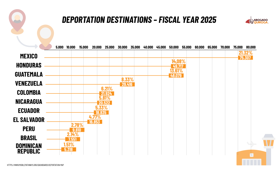 Detailed immigration court data on removal orders shows the top deportation destinations for FY 2025 were: Mexico (21.32%) 75,307 people , Honduras (14.08%) 49,717, Guatemala (13.61%) 48,079, Venezuela (8.33%) 29,416, Colombia (6.21%) 21,924, Nicaragua (5.81%) 20,522, Ecuador (5.33%) 18,835, El Salvador (4.77%) 16,853, Peru (2.78%) 9,810, Brazil (2.14%) 7,551 and Dominican Republic (1.51 %) 5.318.