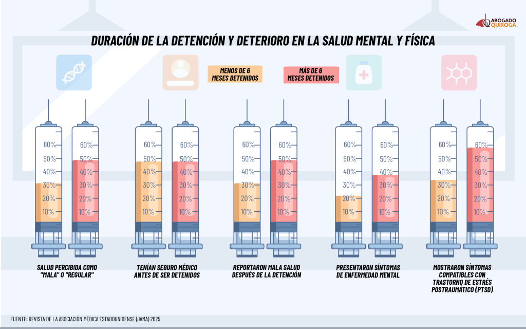 Los resultados mostraron una relación directa entre el tiempo de detención y el deterioro en el estado de salud. Al respecto, La salud mental fue uno de los hallazgos más preocupantes. La percepción de salud “mala o regular” pasa de 30.4% a 49.1%, los síntomas de enfermedad mental suben de 21% a 37%, y los signos compatibles con trastorno de estrés postraumático (PTSD) saltan de 34.8% a 59.3%. El estudio también encontró que cada mes adicional dentro de un centro de ICE empeora la salud: por cada 30 días extra, aumentaba alrededor de un 11 % la probabilidad de tener síntomas significativos de enfermedad mental o estrés postraumático, comparables a contextos de guerra, violencia o encarcelamiento de alto riesgo, lo que demuestra la gravedad del impacto emocional y mental que estos centros generan.