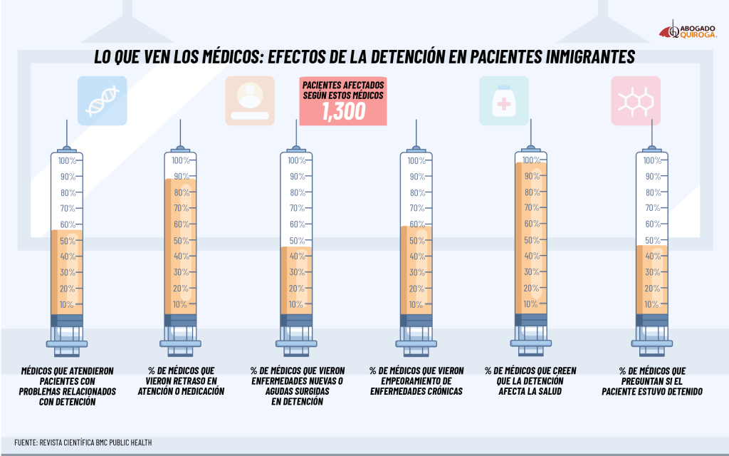 A esto se suma un análisis hecho por la revista científica BMC Public Health, en el que encuestó a 150 profesionales de la salud para entender cómo llegan los inmigrantes después de haber pasado por centros de detención, los resultados son contundentes: más de la mitad de ellos, 85 médicos (57 %), quienes en conjunto han visto a alrededor de 1,300 personas, aseguraron haber atendido pacientes cuyos problemas de salud estaban directamente relacionados con su tiempo de detención. Esta cifra coincide con otro dato revelador: el 98 % de los médicos encuestados consideran que la detención afecta directamente la salud de sus pacientes, lo que refuerza la idea de que el deterioro físico y emocional observado no es aislado, sino un patrón sistemático.
