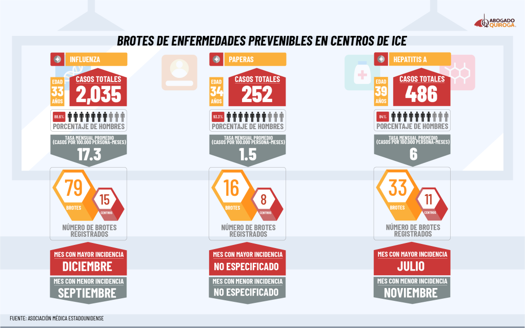 Este panorama se complementa con un análisis publicado en la Revista de la Asociación Médica Estadounidense (JAMA) que examinó la circulación de tres enfermedades prevenibles por vacunación: influenza, paperas y hepatitis A, dentro de 20 centros de detención de inmigrantes administrados por ICE, con corte a 2023 y publicados en 2025. Los resultados muestran que estos centros operan como espacios de transmisión donde los brotes son frecuentes y afectan a un número considerable de personas detenidas.