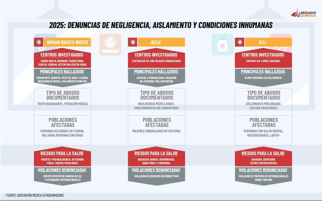 Y mientras estos estudios muestran el daño acumulado durante años, los reportes de 2025 dejan claro que la crisis no solo continúa: se está agravando. En Florida, HRW documentó casos de personas obligadas a dormir en el piso, bajo luces encendidas 24 horas, trasladadas esposadas sin agua ni alimento, o sin acceso a medicamentos esenciales. Incluso se reportan muertes recientes potencialmente vinculadas a negligencia médica.