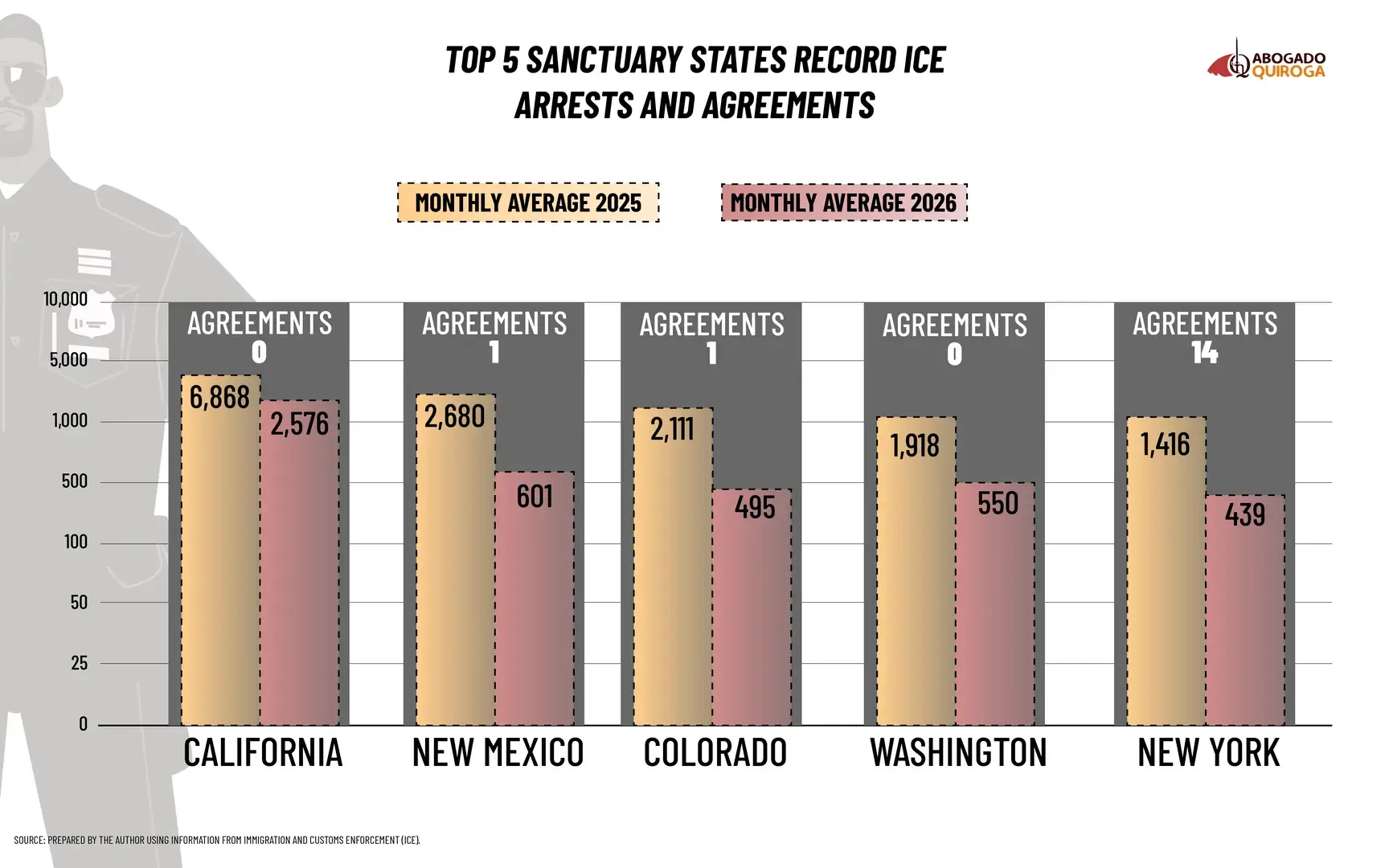 These numbers help us understand that the size of the state, its geographic location, and the infrastructure maintained by the federal government in each of them can have a greater influence than simply not cooperating with ICE. In the case of states like California or New Mexico, their proximity to the southern border and the historical presence of immigration detention centers help explain why they continue to appear among the places with the highest number of arrests.
