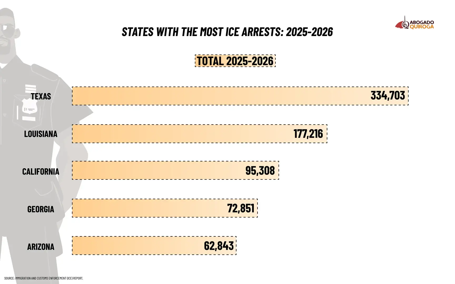 States like Texas, Louisiana, California, Georgia, and Arizona appear time and again among the places where the highest number of ICE arrests are concentrated, and although the numbers are not as high in so-called sanctuary states, the data shows that arrests also occur there, even in territories where local authorities limit their cooperation with federal immigration agencies.