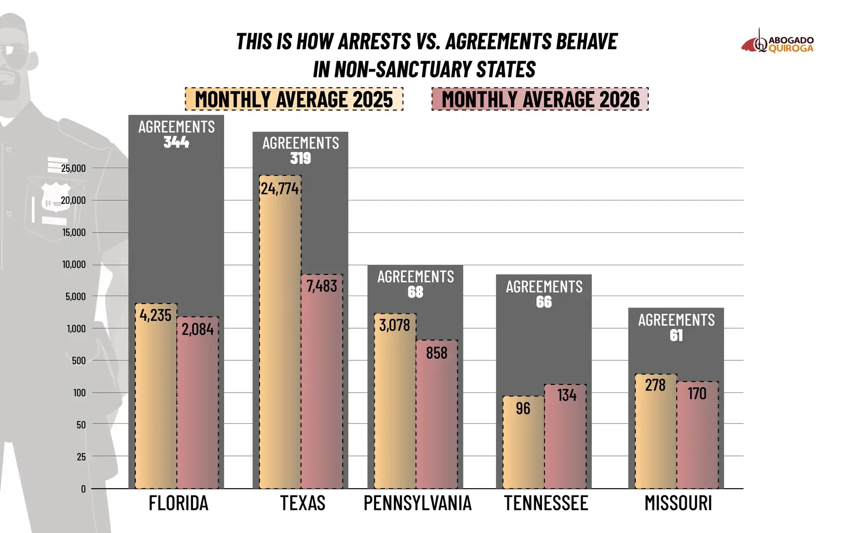 Other examples include Tennessee, which, with 66 agreements, recorded around 96 arrests per month in 2025, while in 2026 the average is 134 per month. Missouri, with 61 agreements, had approximately 278 arrests per month in 2025, compared to 170 per month in 2026. In Alabama, with 54 agreements, the average was 126 arrests per month in 2025 and about 55 per month in 2026.