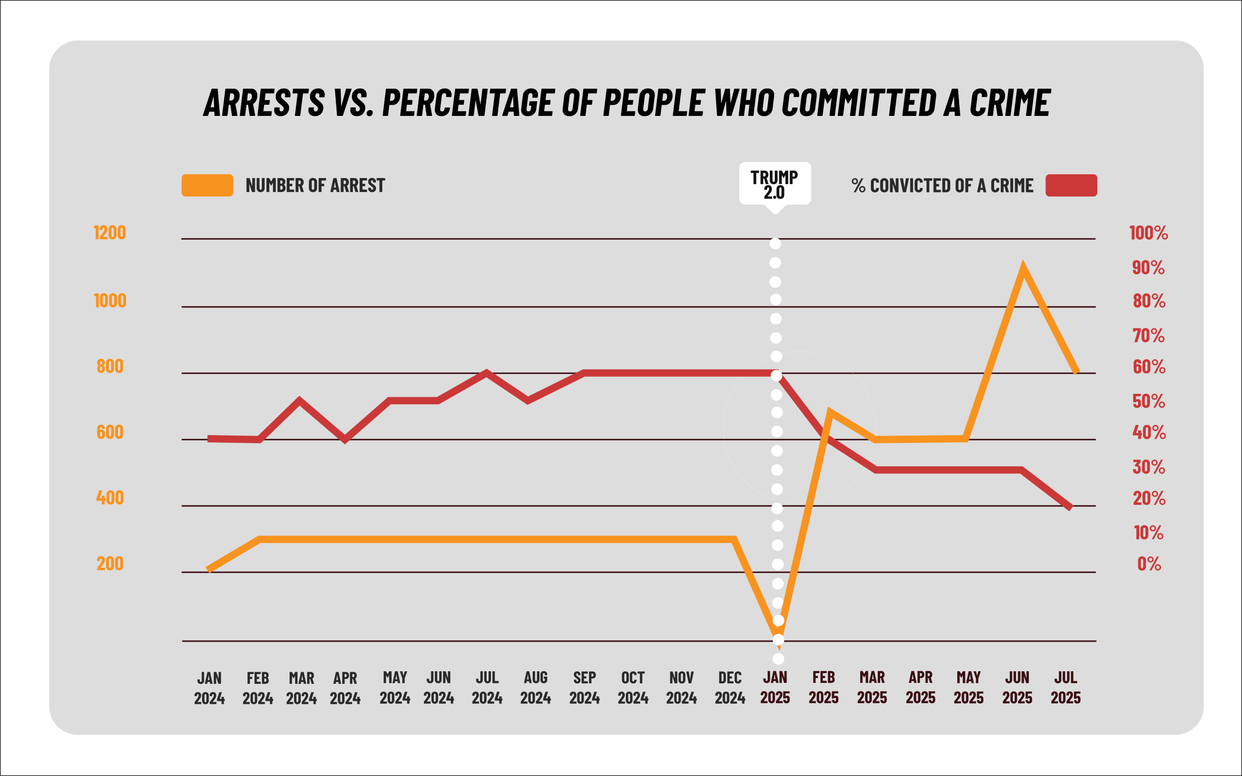 Regarding this, in 2024 the daily average of arrests by ICE remained stable at about 200. Once the new administration took office in 2025, the figure tripled, reaching about 600 daily. As of May, arrests increased even further reaching about 1,000 per day, a situation that coincided with the order to carry out 3,000 daily arrests entrusted to ICE. However, this goal is still far from being met and, in fact, the number of people arrested, at least by the end of June, decreased by approximately 800 people per day. (https://immresearch.org/publications/who-is-ice-arresting/)