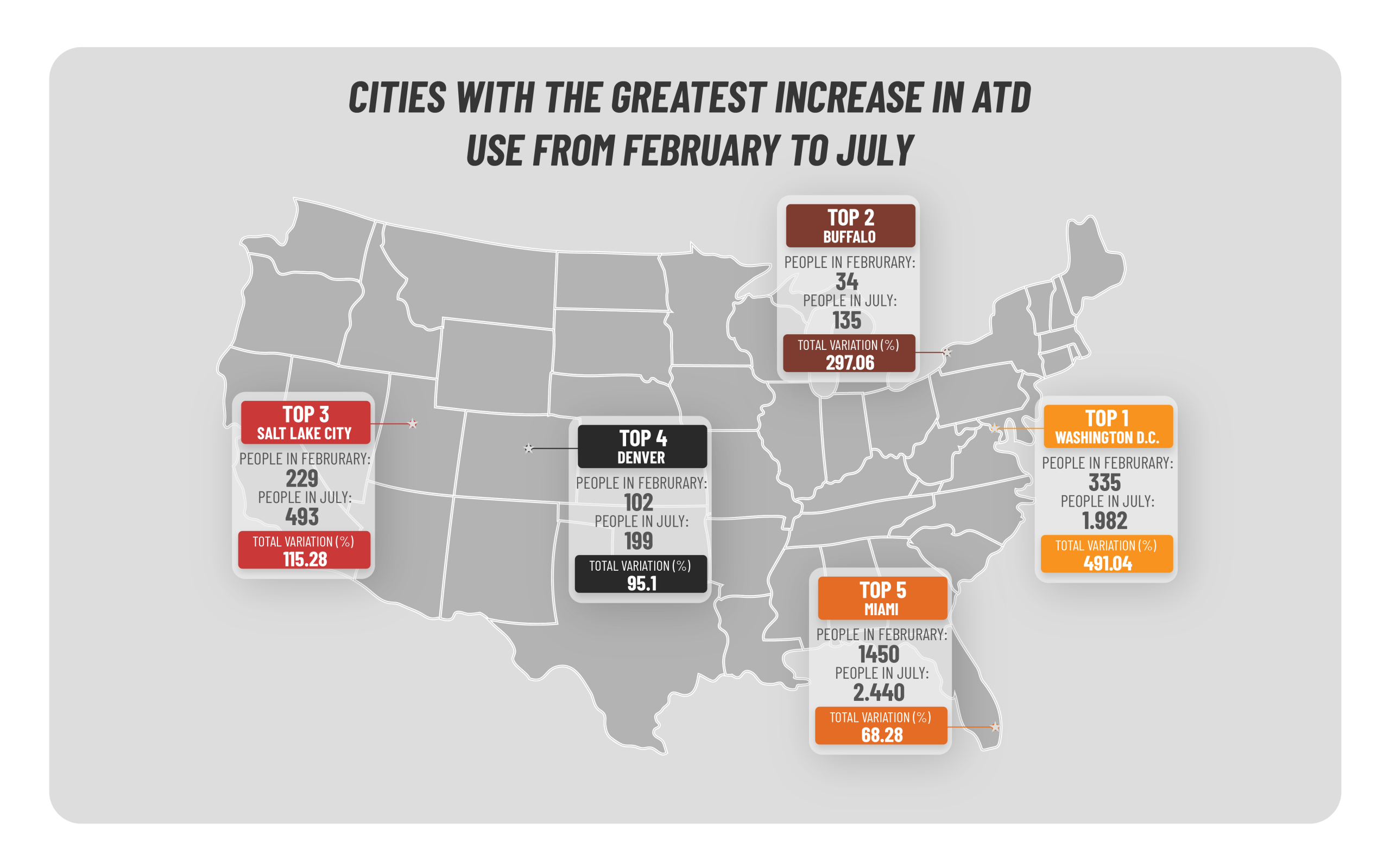 From June to July, the rate of increases was again led by Washington D.C. with 63.5% (1,212 → 1,982), followed by Salt Lake City 35%, San Antonio 32%, Buffalo 22%, and Miami 16%.