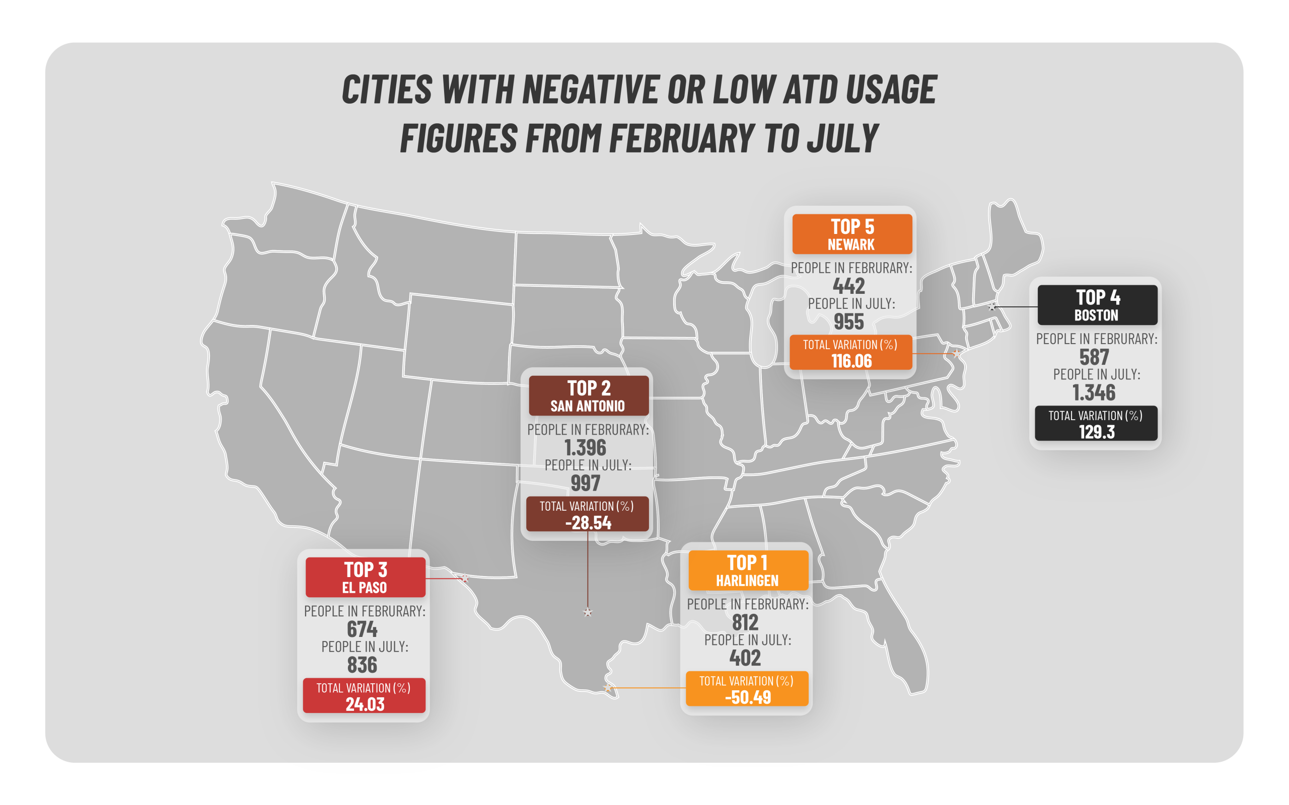 However, some specific cities pulled the numbers up in certain months. From February to March, one of the most significant was Denver, which had an 80% variation going from 102 to 184 people, followed by Newark, which added 39% going from 442 to 617 people with this technology. In contrast, during that period cities such as San Antonio (-42%), Harlingen (-37%), and El Paso (-25%) decreased the number of people using this technology.