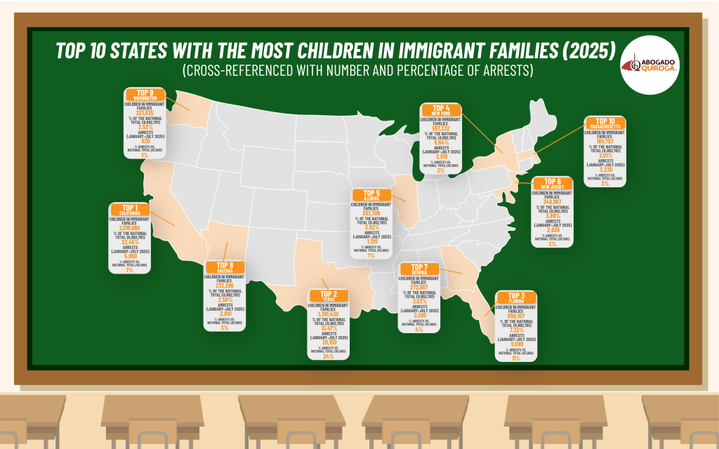 - Washington appears among the 10 with the most immigrant children, but with a low incidence of arrests (1 %), which could reflect a more protective state policy or less ICE activity.