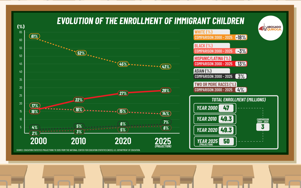 Between 2000 and the projections for 2025, U.S. public schools have undergone a profound transformation in their ethnic and racial composition. Although total enrollment grew from 47 to 50 million students, a modest increase of 6.4%, the internal change in the distribution of groups is markedly structural.